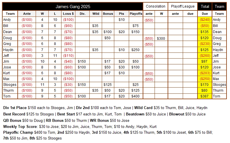 | Juice | 6 – 7 | 1423.10 | Pain Train | Clinches Playoff Spot If: 1. Juice, Fartz, The U win and Hounds, S*Heads, Buck lose. 2. Juice, Hounds, Fartz, The U win and Buck, S*Heads lose. 3. Juice, Fartz win and Hounds, S*Heads, Buck, Juice, The U lose. 4. Juice, Fartz, Hounds win and S*Heads, Buck, The U lose. 4. Juice, Fartz, Hounds win and S*Heads, Buck, The U lose. Clinches Tie for Playoff Spot with a WIN If: 1. Juice, Buck, S*Heads, The U win and Fartz, Hounds lose. Five teams tie at 7-7 for three spots: Juice, S*Heads, Buck, Hounds, Fartz 2. Juice, S*Heads, The U win and Fartz, Hounds, Buck lose. Four teams tie at 7-7 for three spots: Juice, S*Heads, Hounds, Fartz 3. Juice, Buck, S*Heads win and Fartz, Hounds, The U lose. Five teams tie at 7-7 for three spots: Juice, S*Heads, Buck, Hounds, Fartz 4. Juice, Buck, The U, S*Heads, Hounds win and Fartz loses. Four teams tie at 7-7 for two spots: Juice, S*Heads, Buck, Fartz 5. Juice, Hounds, S*Heads, The U win and Fartz, Buck lose. Three teams tie at 7-7 for two spots: Juice, S*Heads, Fartz 6. Juice, Buck, Hounds, S*Heads win and Fartz, The U lose. Four teams tie at 7-7 for two spots: Juice, S*Heads, Buck, Fartz 7. Juice, Buck, Fartz, The U win and S*Heads, Hounds lose. Three teams tie at 7-7 for two spots: Juice, Buck, Hounds 8. Juice, Buck, Fartz win and S*Heads, Hounds, The U lose. Four teams tie at 7-7 for three spots: The U, Juice, Buck, Hounds 9. Juice, Buck, Fartz, The U, Hounds win and S*Heads lose. Two teams tie at 7-7 for one spot: Juice, Buck 10. Juice, Buck, Fartz, Hounds win and S*Heads, The U lose. Three teams tie at 7-7 for two spots: The U, Juice, Buck 11. Juice, S*Heads win and Fartz, The U, Hounds, Buck lose. Four teams tie at 7-7 for three spots: Juice, S*Heads, Hounds, Fartz 12. Juice, S*Heads, Hounds win and Fartz, The U, Buck lose. Three teams tie at 7-7 for two spots: Juice, S*Heads, Fartz Clinches Tie for Playoff Spot with a LOSS If: 1. Juice, Buck, S*Heads, Hounds lose and Fartz, The U win. Three teams tie at 6-8 for one spot: Juice, S*Heads, Buck 2. Juice, Buck, S*Heads lose and Fartz, The U, Hounds win. Three teams tie at 6-8 for one spot: Juice, S*Heads, Buck 3. Juice, Buck, S*Heads, The U, Hounds lose and Fartz wins. Three teams tie at 6-8 for one spot: Juice, S*Heads, Buck 4. Juice, Buck, The U, S*Heads lose and Hounds, Fartz win. Three teams tie at 6-8 for one spot: Juice, S*Heads, Buck Eliminated from Playoffs If 1. Juice loses and Buckguys and/or S*Heads win |