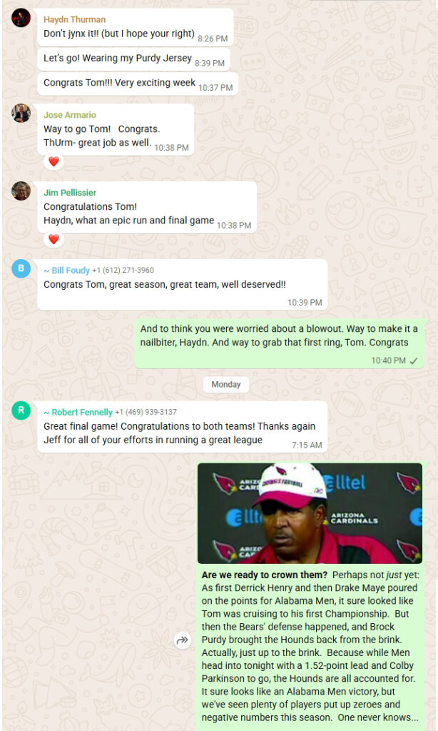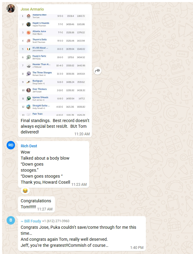 The “League Winner” theory would seem to recognize a combination of draft skill, waiver wizardry, and injury luck. Tom drafted Maye, St Brown, Texans D/ST and Henry, who together provided 267.14 of his 385.54 playoff points. Colby Parkinson, picked up on waivers in week 14, put in another 39.90. His biggest injury loss was his 8th-round draft pick Tucker Kraft, who was TE3 at the time he went down in Week 9; Men were 6-2 at that point.
