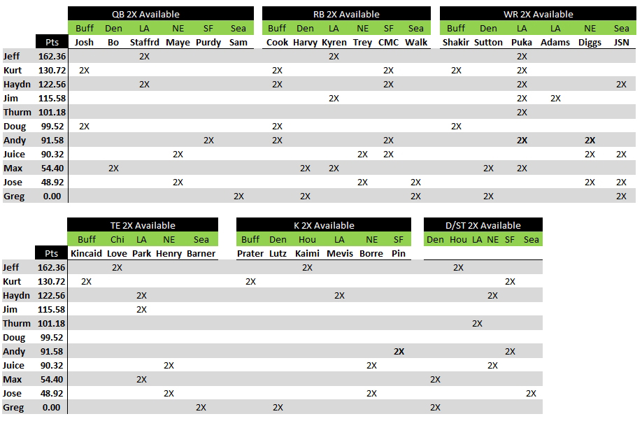 On to Round 2 we go, and with it the multipliers that kick in for guys we’ll carry over from Round 1. Below is a grid of 2X players available to each of us; we can assume all will play. Or will everyone do the right thing and drop all their Rams and Seahawks and Patriots, and JUST GRAB SOME BEARS!!!!!